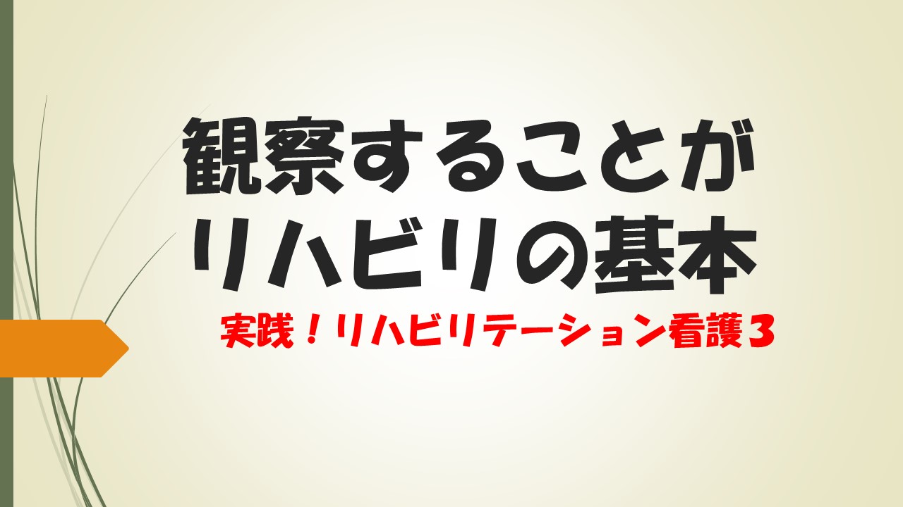 観察以外で得られた情報も、リハビリテーション看護には役に立ちます。しかし、脳血管疾患などを中心にリハビリテーションに積極的にかかわる時期の患者さんというのは、病状の安定している患者さんが多いので、多くのデータも役に立ちますが、観察という評価手段も役に立つのです。